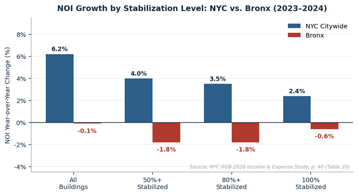 What makes the Bronx picture more concerning is that the 2025 Income and Expense Study, reporting 2022-2023 data, already showed the warning signs. Bronx pre-1974 buildings that were 100% stabilized posted NOI of -0.1% in that report, essentially flat but technically negative. One year later, the same cohort sits at -2.3%. The 80%+ stabilized pre-1974 cohort moved from +0.2% to -2.8%. The 50%+ stabilized cohort moved from +0.3% to -2.8%. This is not a single-year data spike. It is a deteriorating trend that was already visible in the prior report, accelerating in the current one.